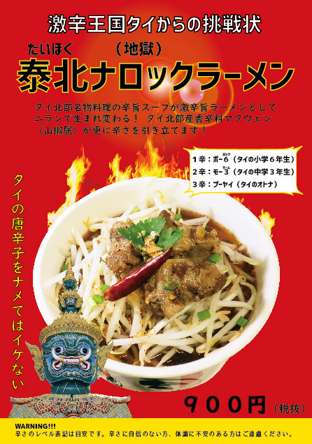 そんなわけでやっとメニュー化にこぎつけたナロックラーメン。 本当に辛いです。激辛好きの方々、是非ご賞味くださいませ。 ルットシェフの地元タイ北部の味が、日本の皆様にお伝えできれば光栄です。